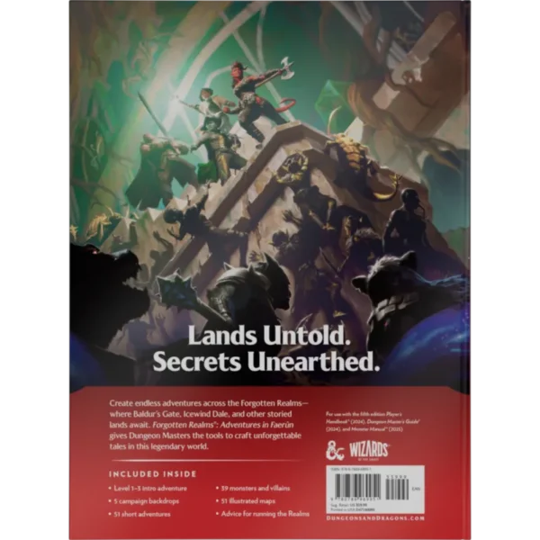 W podręczniku znajdziesz przygodę wprowadzającą na poziomy 1–3 oraz 51 krótkich przygód. Do tego 5 motywów kampanii, 39 potworów i złoczyńców, 51 ilustrowanych map oraz porady dotyczące prowadzenia gry w Zapomnianych Krainach.